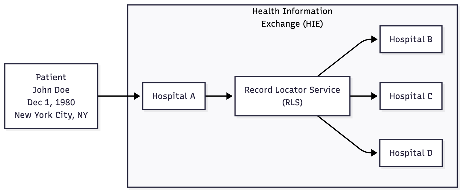 A healthcare provider on the network sends a query containing these demographics, asking the other institutions on the HIE network: Do you have any medical records for an individual who matches this combination of attributes?